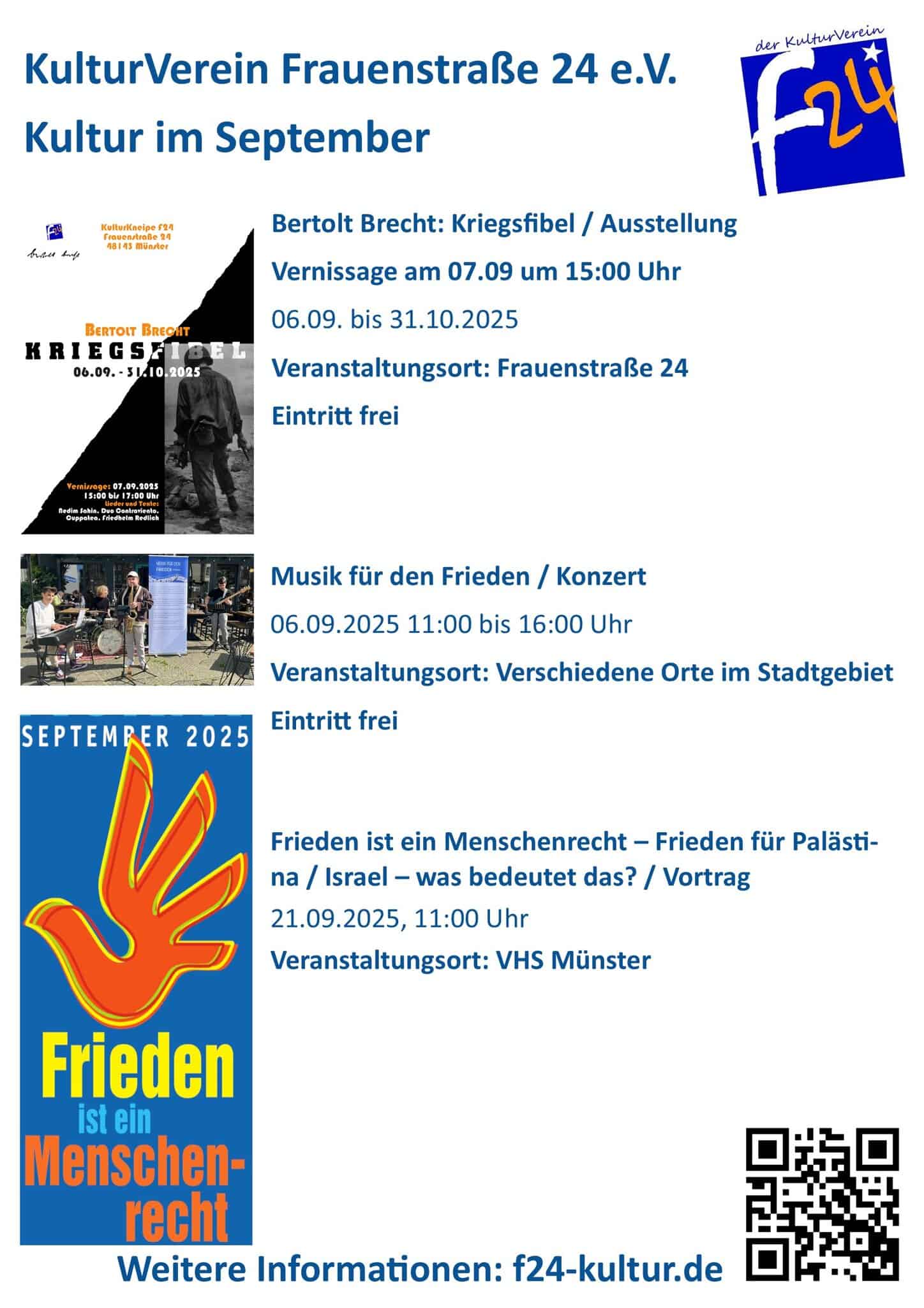 Am 7. September ist die Vernissage zur Ausstellung von Bertolt Brechts Kriegsfibel in der F24. Nedim Sahin, das Duo Contraviento, Cuppatea und Friedhelm Redlich werden Lieder und Texte passend zur Botschaft der Kriegsfibel vortragen.
