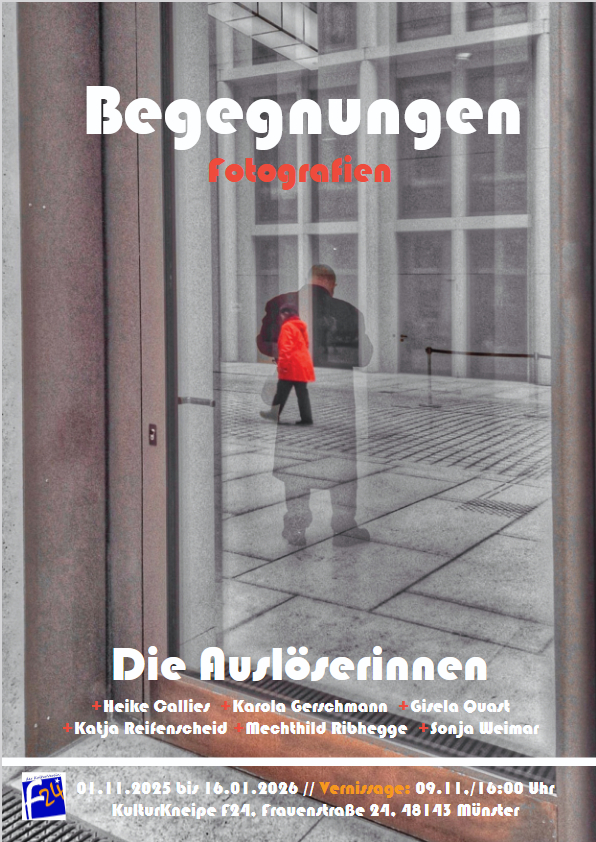 Die Vernissage findet am 9. November 2025 ab 16:00 Uhr in der F24, Frauenstraße 24, Münster, statt. Mit dem Team des Kulturvereins haben wir uns am 5. Oktober zu einer Vorbesprechung getroffen“. (Die Auslöserinnen)