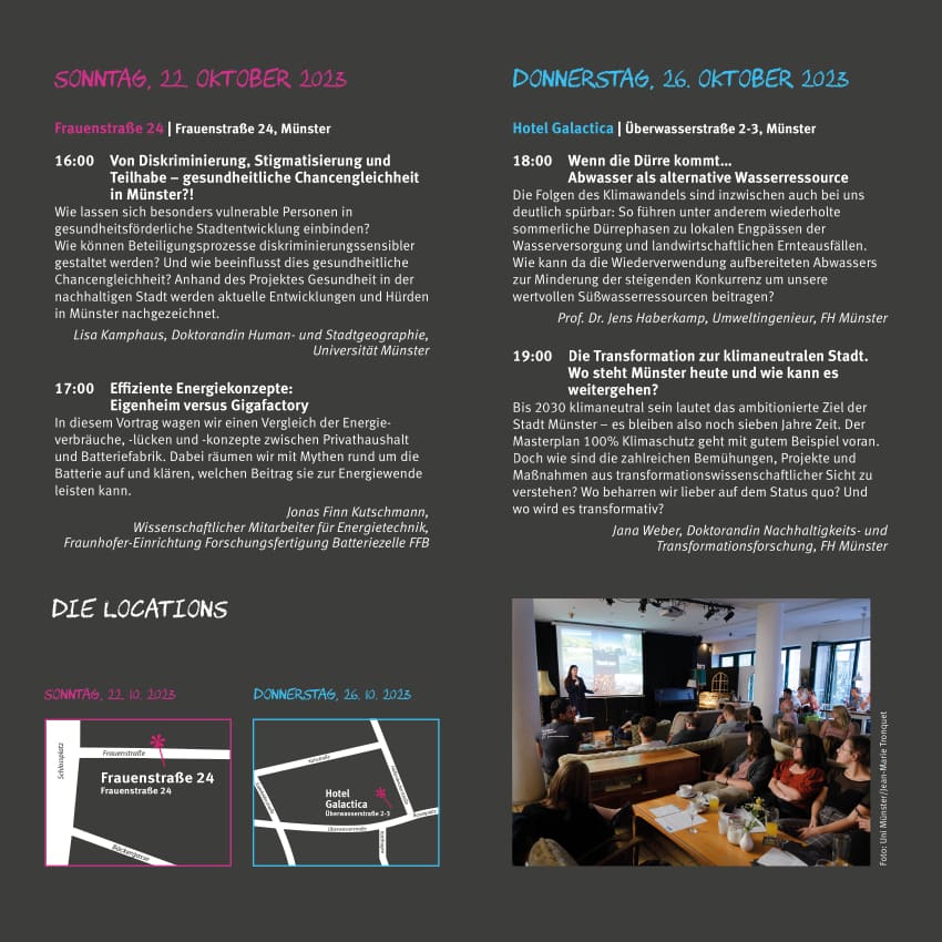 Hier können Sie das Wissen von Forscherinnen und Forschern aus Münster „anzapfen“! Im Rahmen der städtischen Klimawoche gibt es außer der Reihe eine Ausgabe von „Münsters Wissen frisch gezapft“ mit vier Vorträgen rund ums Klima – im F24 und im Hotel Galactica.