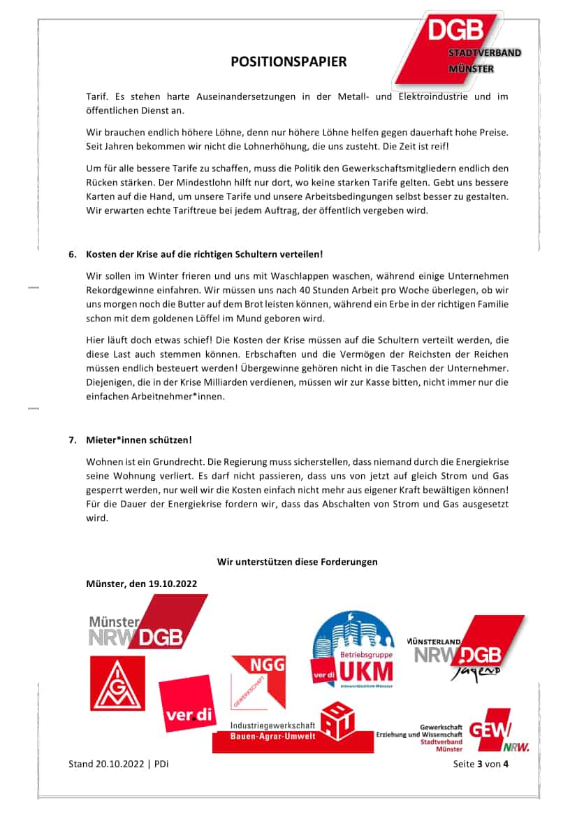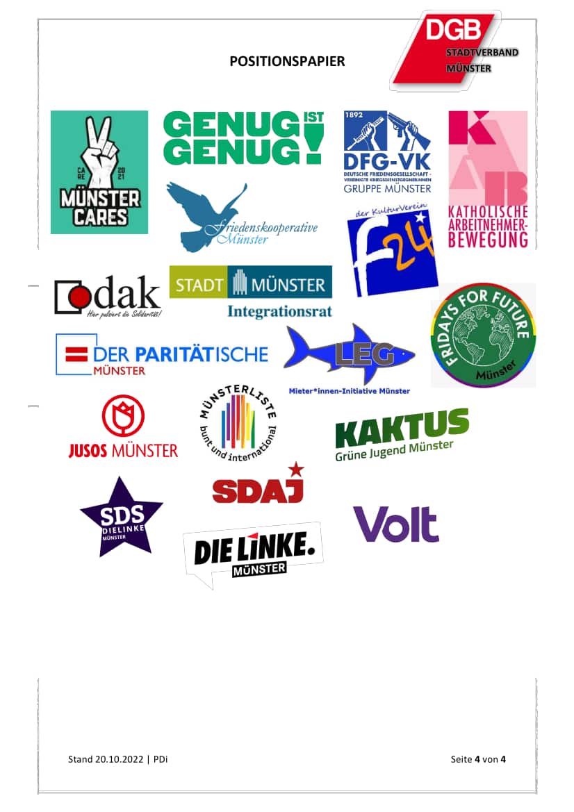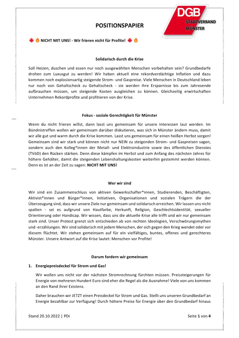 Wir sind ein Zusammenschluss von aktiven Gewerkschafter*innen, Studierenden, Beschäftigten, Aktivist*innen und Bürger*innen, Initiativen, Organisationen und sozialen Trägern die der Überzeugung sind, dass wir unsere Ziele nur gemeinsam und solidarisch erreichen. Wir lassen uns nicht spalten – sei es aufgrund von Hautfarbe, Herkunft, Religion, Geschlechtsidentität, sexueller Orientierung oder Handicap. Wir wissen, dass uns die aktuelle Krise alle trifft und wir nur gemeinsam stark sind. Unser Protest grenzt sich entschieden ab von rechten Ideologien, Verschwörungsmythen und -erzählungen. Wir sind solidarisch mit jedem Menschen, der sich gegen den Krieg wendet oder vor diesem flüchtet. Wir stehen gemeinsam auf für ein vielfältiges, buntes, offenes und gerechteres Münster. Unsere Antwort auf die Krise lautet: Menschen vor Profite!