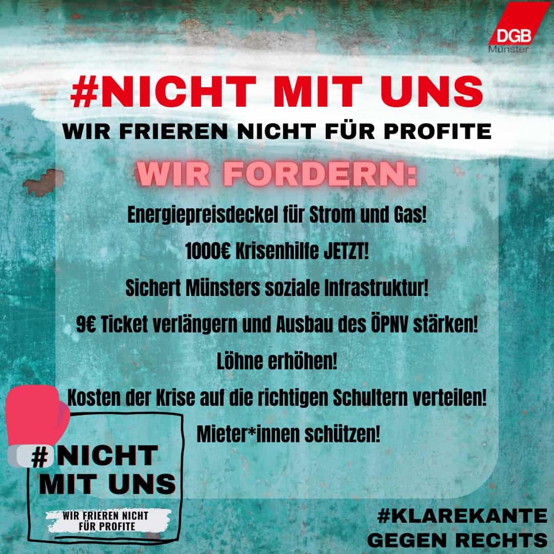 Wenn du nicht frieren willst, dann lasst uns gemeinsam für unsere Interessen laut werden. Im Bündnistreffen wollen wir gemeinsam darüber diskutieren, was sich in Münster ändern muss, damit wir alle gut und warm durch die Krise kommen. Lasst uns gemeinsam für einen heißen Herbst sorgen! Gemeinsam sind wir stark und können nicht nur NEIN zu steigenden Strom- und Gaspreisen sagen, sondern auch den Kolleg*innen der Metall- und Elektroindustrie sowie des öffentlichen Dienstes (TVöD) den Rücken stärken. Denn diese kämpfen im Herbst und zum Anfang des nächsten Jahres für höhere Gehälter, damit die steigenden Lebenshaltungskosten weiterhin gestemmt werden können. Denn es ist an der Zeit zu sagen: NICHT MIT UNS!