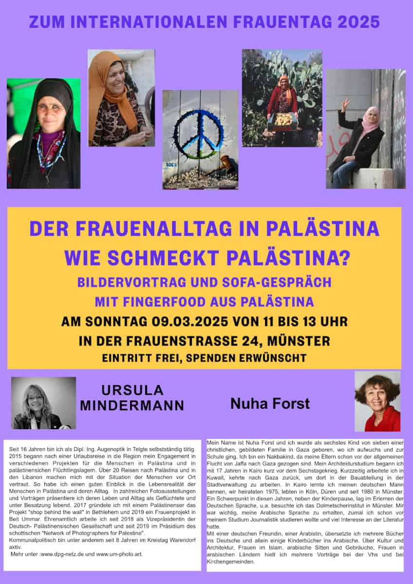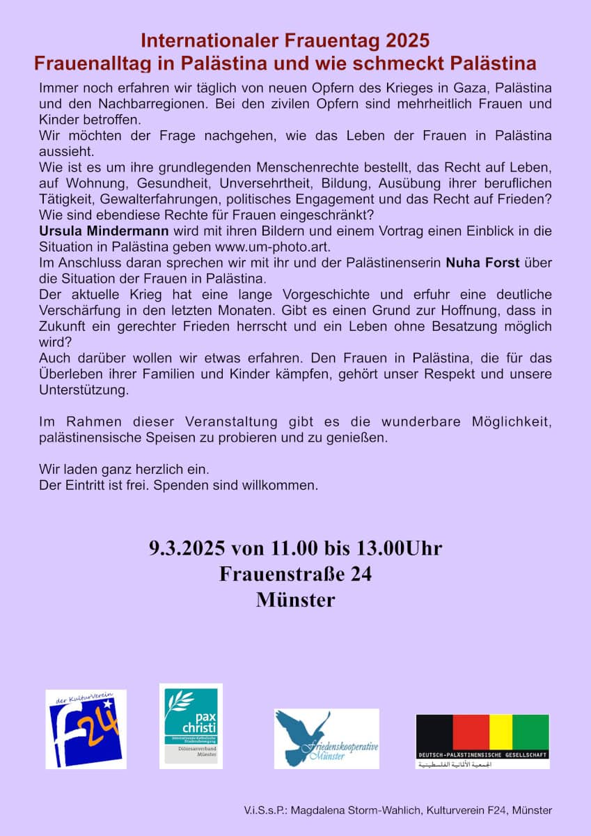 Veranstalter: KulturVerein Frauenstraße 24, in Kooperation mit Pax Christi, Friedenskooperative Münster und der Deutsch-Palästinensischen Gesellschaft